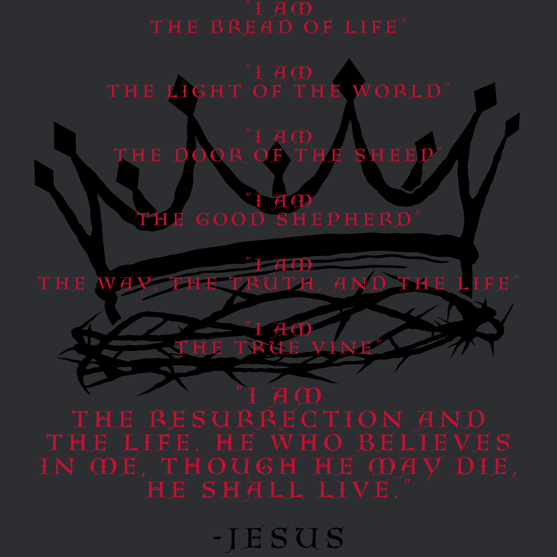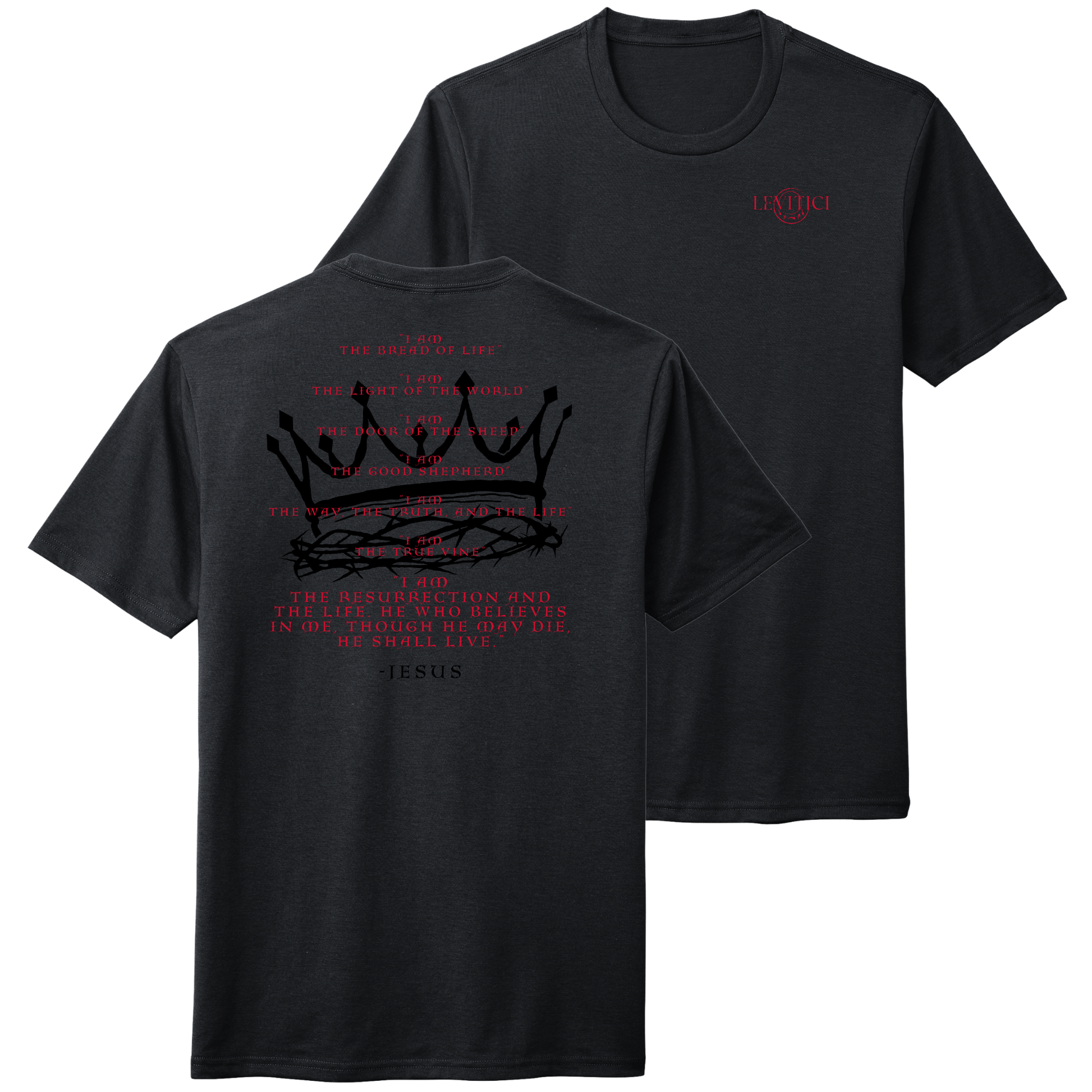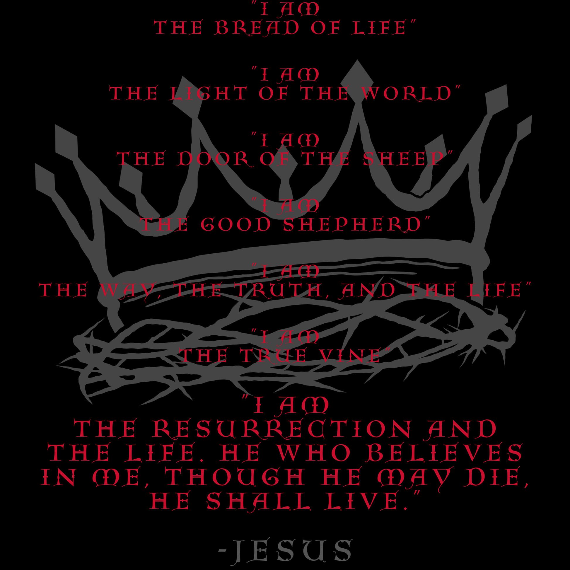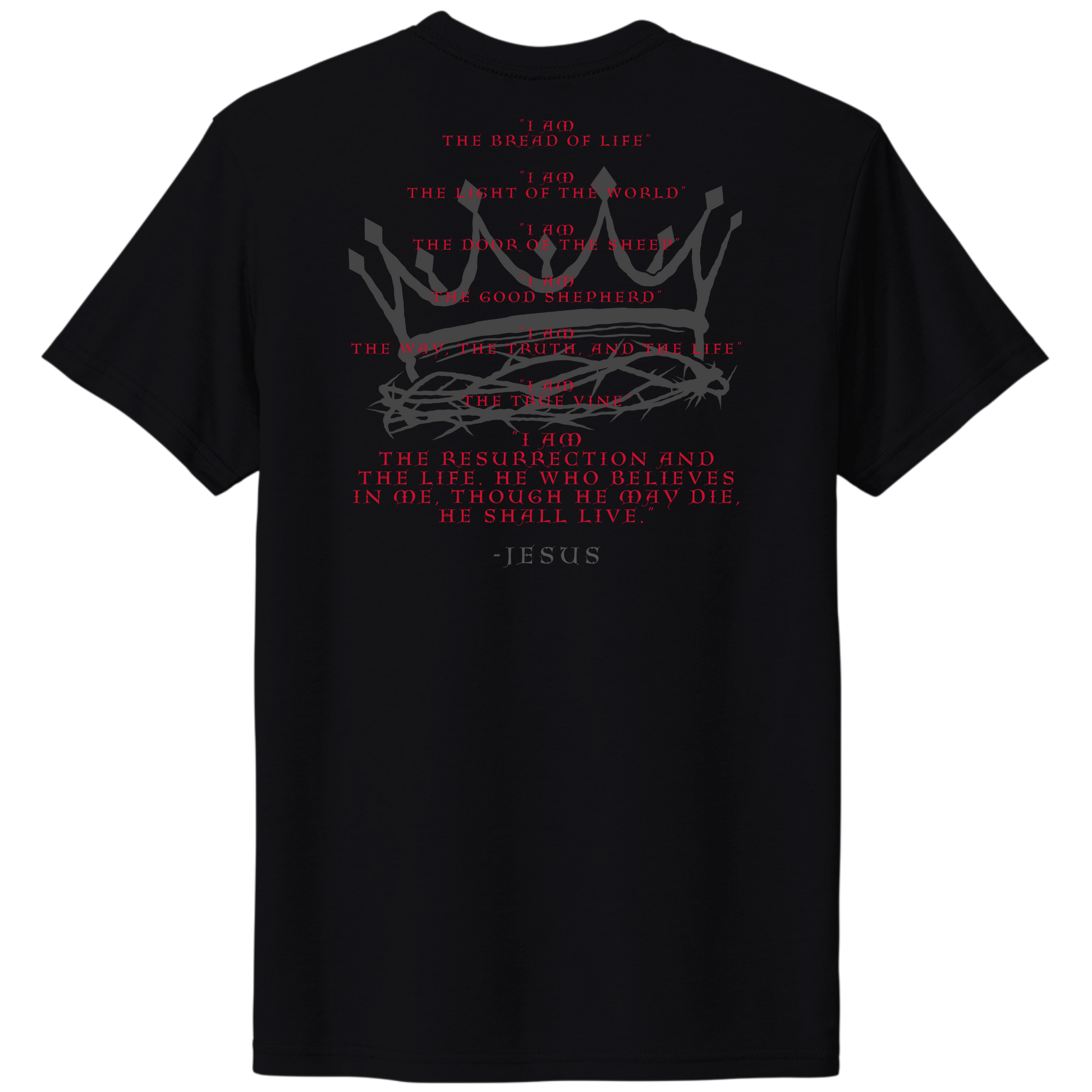 “I am” is used many times in the Bible, however there are 7 specific times Jesus proclaims, “I AM”, to reveal His Divine Nature and His relationship with the Holy Spirit as part of the Trinity. The I AM Tee is a perfect way to proclaim our faith outwardly, and hopefully invite questions from the curious, the inquisitive, the biased, and the lost! PLANT THE SEED AND LET THE LORD DO WHAT HE DOES BEST!