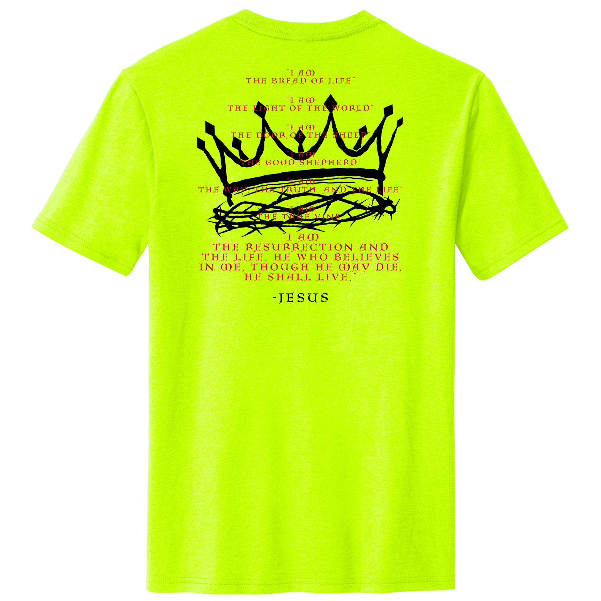 “I am” is used many times in the Bible, however there are 7 specific times Jesus proclaims, “I AM”, to reveal His Divine Nature and His relationship with the Holy Spirit as part of the Trinity. The I AM Tee is a perfect way to proclaim our faith outwardly, and hopefully invite questions from the curious, the inquisitive, the biased, and the lost! PLANT THE SEED AND LET THE LORD DO WHAT HE DOES BEST!